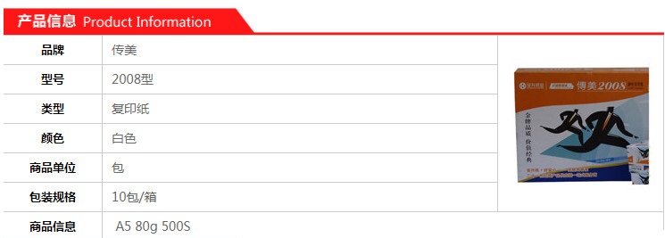 • 商品名称:传美 2008型 复印纸 A5 80G 10包/箱 白色.wy.
