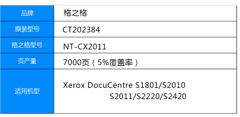• 商品名称:格之格/G&G 复印机粉盒 NT-CX2011X 黑色 适用施乐S1801/S2010/S2011/S2220/S2420系列